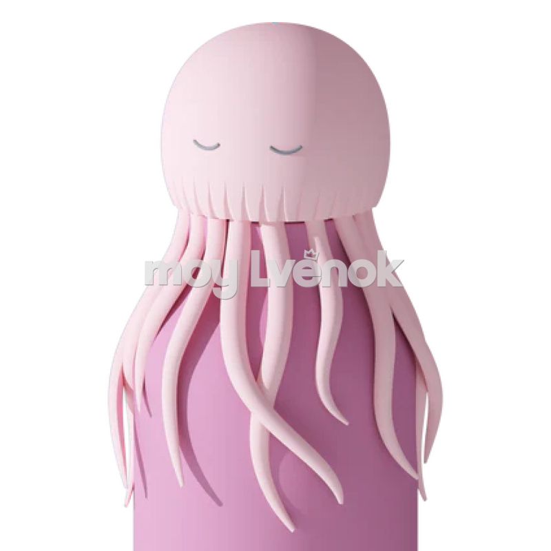 Фиолетовый термос с медузой на крышке — объёмная силиконовая голова с щупальцами превращает бутылку в морское приключение. Двустенная конструкция сохраняет температуру напитков, мягкая поверхность удобна в использовании, соломинка в комплекте. Подводный житель для наземных будней. Необычный дизайн для тех, кто предпочитает выделяться из толпы стандартных термосов.