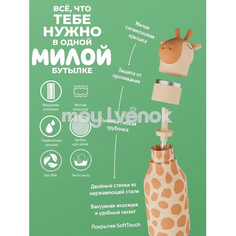 Термос с жёлтым жирафом на крышке — объёмная силиконовая фигурка с длинной шеей добавляет высоты каждому дню. Двустенная конструкция сохраняет холод и тепло, мягкая поверхность уверенно лежит в ладони, соломинка идёт в комплекте. Африканский персонаж для городских джунглей. Коллекционная серия для тех, кто ценит оригинальность в деталях.