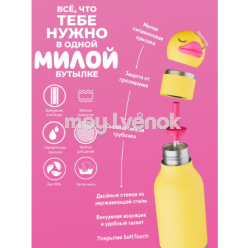 Жёлтый термос с утёнком на крышке — объёмная силиконовая голова с оранжевым клювом добавляет солнечное настроение каждому дню. Вакуумная изоляция надёжно сохраняет температуру, прорезиненная поверхность не скользит в ладони, встроенная соломинка делает питьё комфортным. Весенний персонаж для всех возрастов. Коллекционный дизайн для тех, кто не забыл радоваться простым вещам.