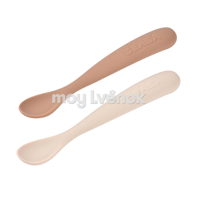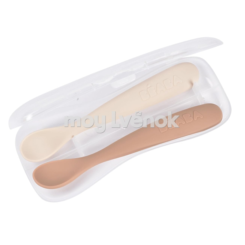 Beaba 913599 Набор из двух силиконовых ложек 4М+, с боксом для хранения. Clay / Praline