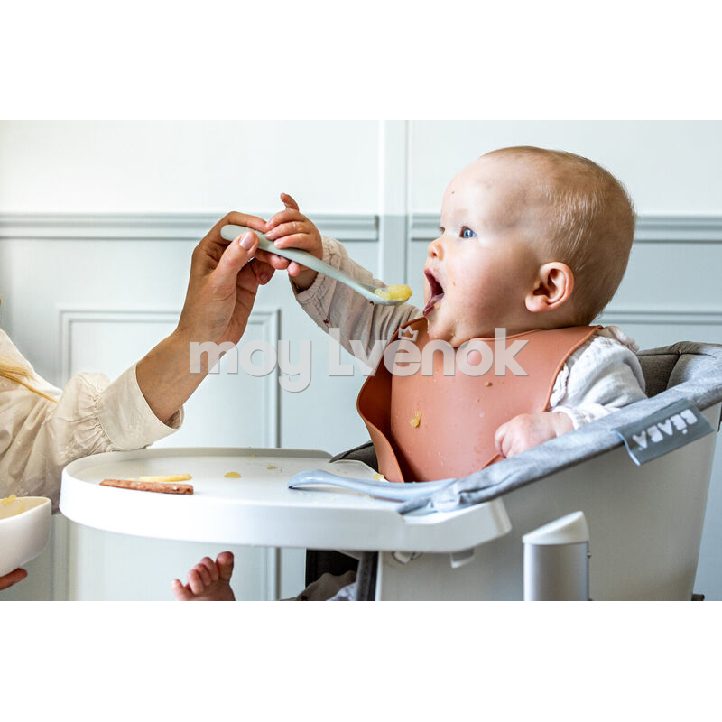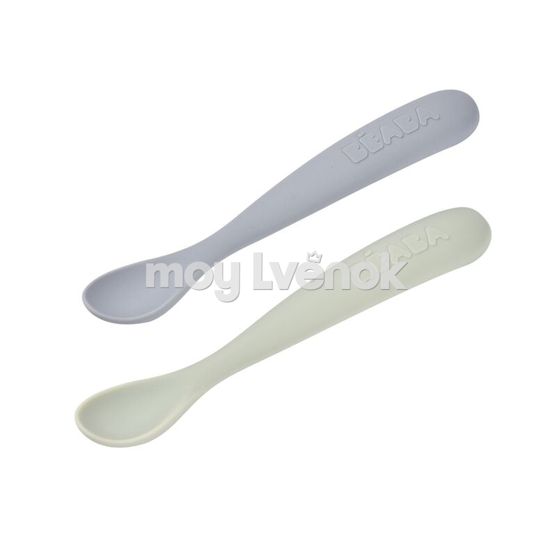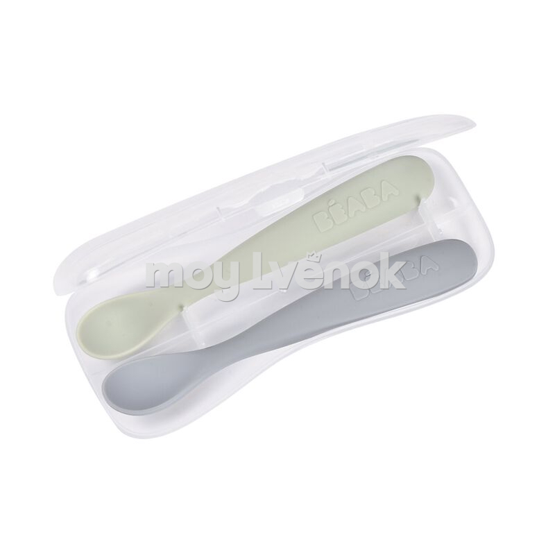 Beaba 913600 Набор из двух силиконовых ложек 4М+, с боксом для хранения. Pebble / Green of grey