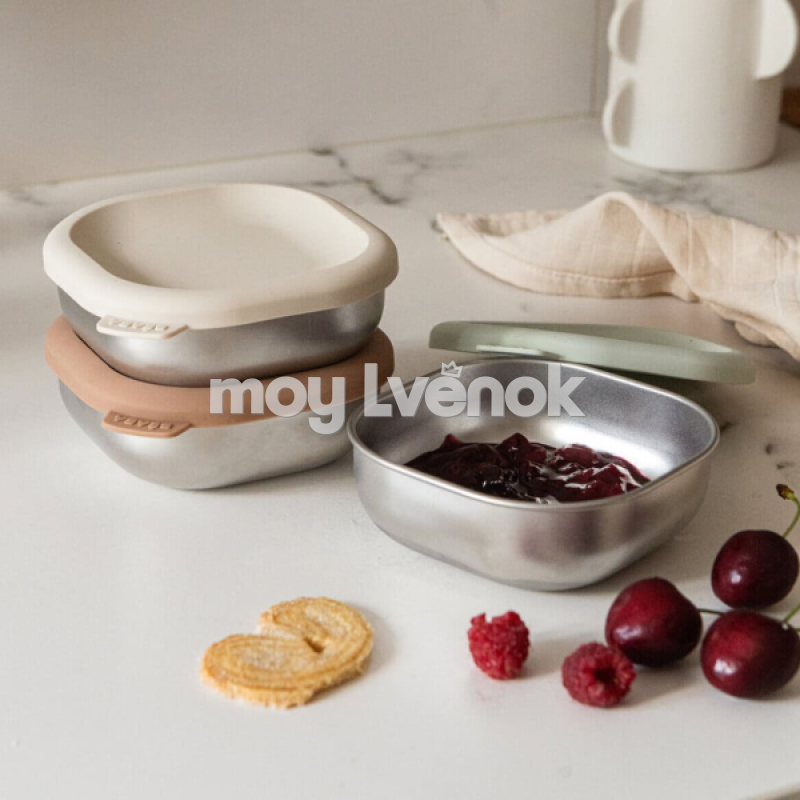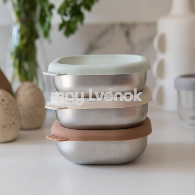 Набор из 3-х контейнеров из нержавеющей стали с силиконовыми крышками подходит для хранения, транспортировки и разогрева первых домашних блюд.