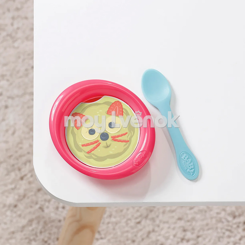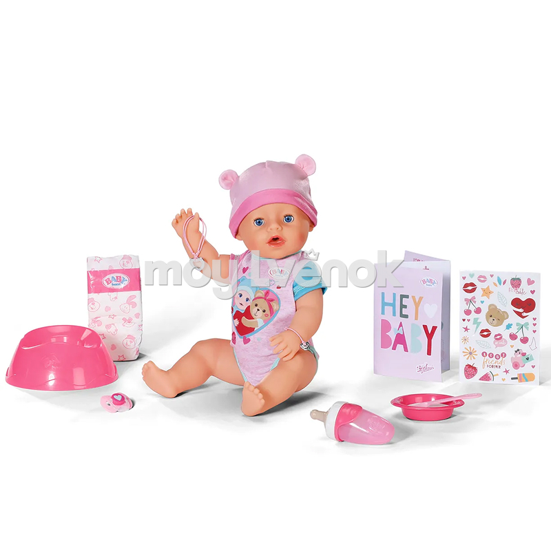 В комплекте 10 аксессуаров: свидетельство о рождении, бутылочка для питья, подгузник, соска, тарелка, ложка, горшок, альбом со стикерами, 2 браслета, инструкция.