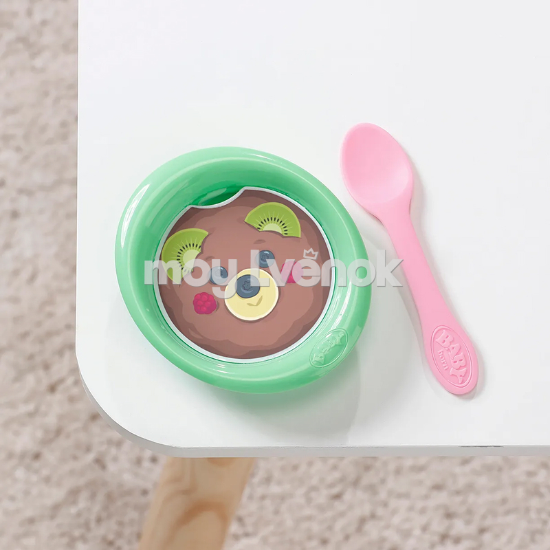 В комплекте 10 аксессуаров: свидетельство о рождении, бутылочка для питья, подгузник, соска, тарелка, ложка, горшок, альбом со стикерами, 2 браслета, инструкция.