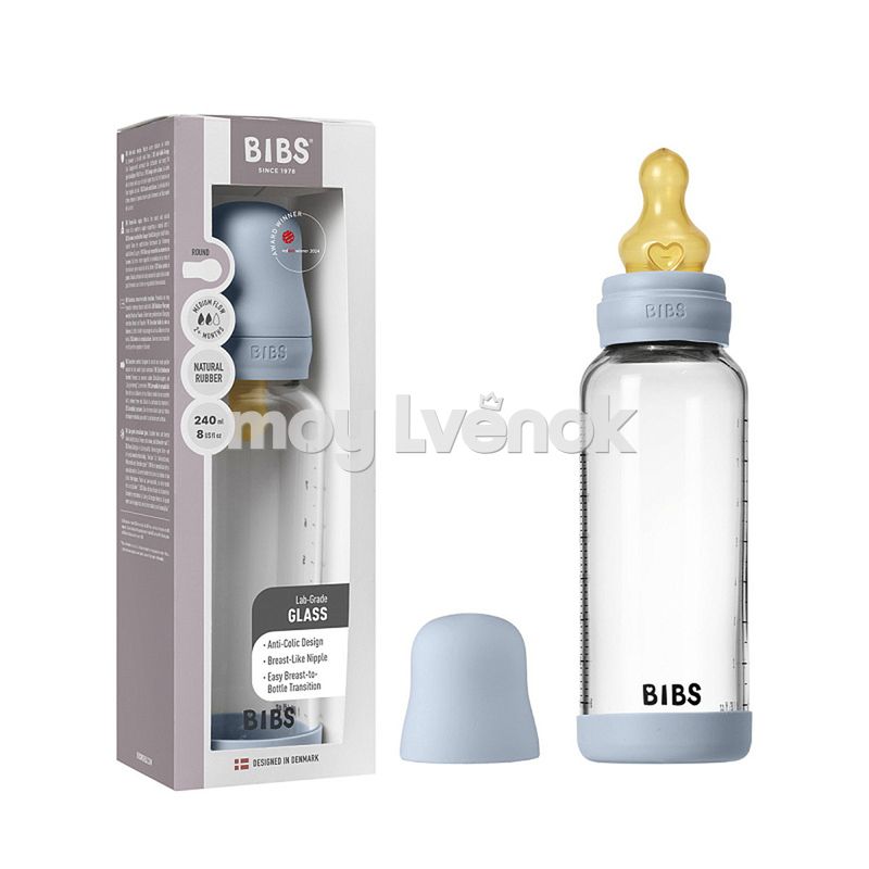 BIBS - Baby Blue Стеклянная бутылочка с латексной соской, средний поток 240 мл 5020231