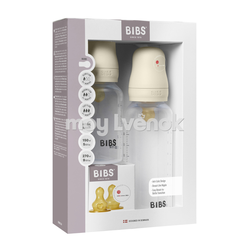 Набор из двух невесомых бутылочек для кормления разных объёмов, воронки, кольца против протекания, сменной крышки и 4 латексных сосок с разными скоростями потока. Идеальный комплект, чтобы собрать бутылочку, отвечающую потребностям именно вашей семьи, или сделать великолепный подарок.