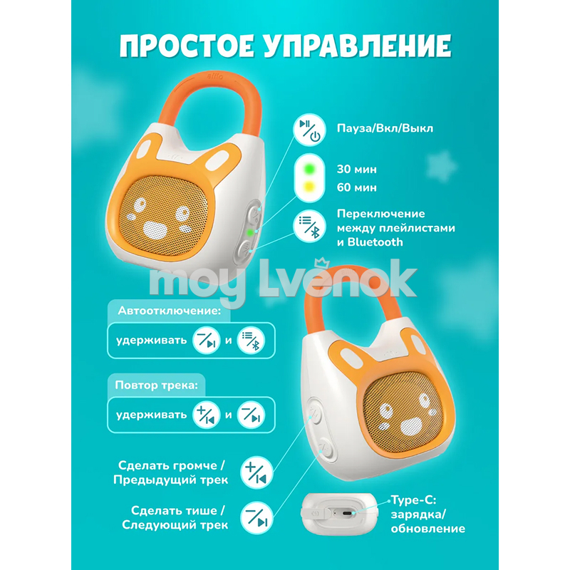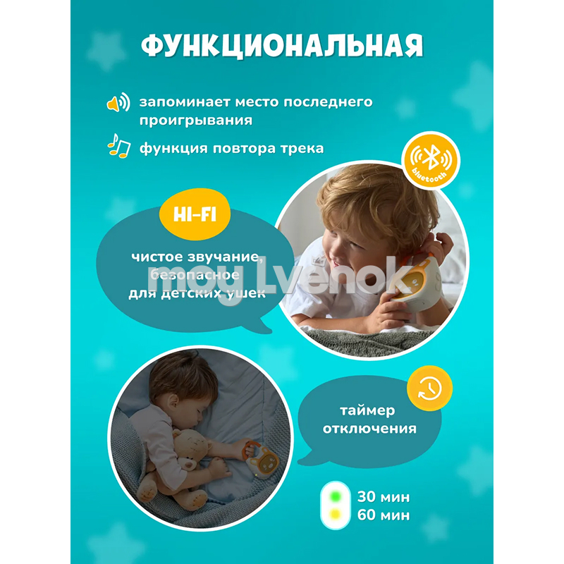– Автоотключение через 30 или 60 минут. Установите таймер – колонка сама выключится, если ребёнок уснул.