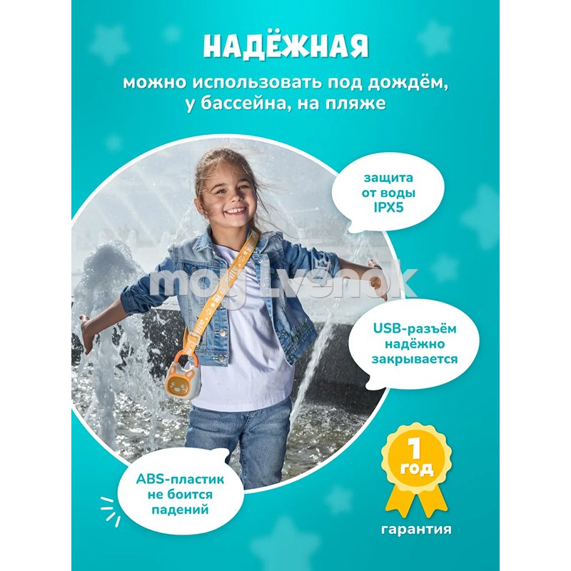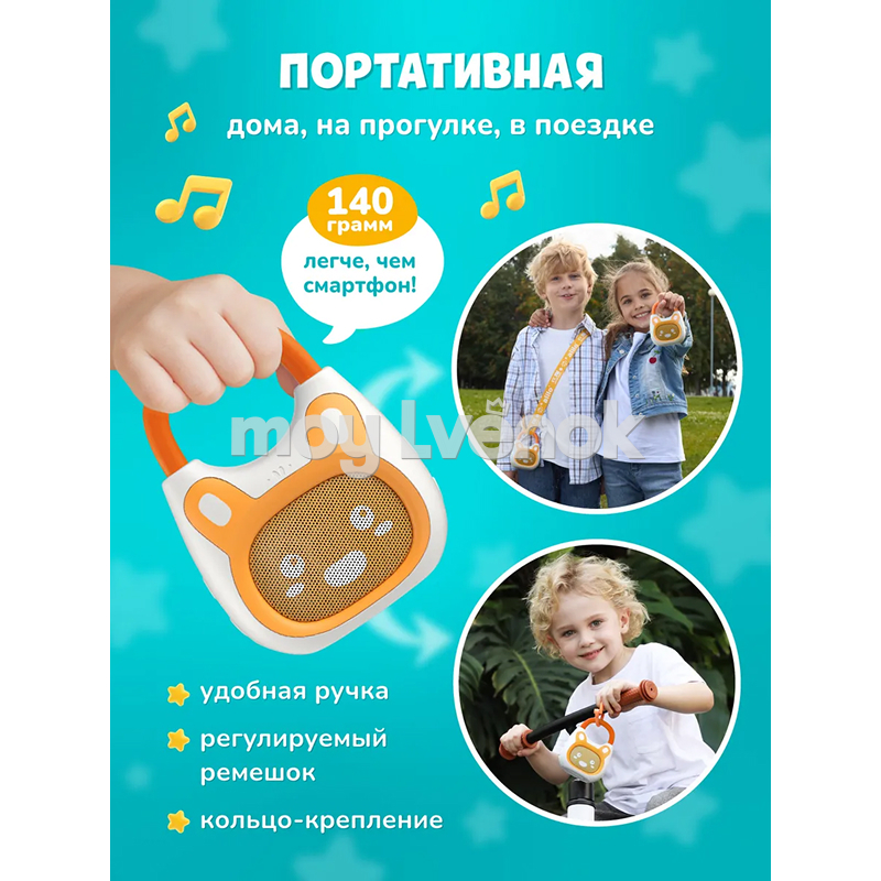 – Удобно для малышей. Колонка детская, поэтому весит всего 140 грамм – легче, чем смартфон. В комплекте ремешок, чтобы носить через плечо, и кольцо, чтобы крепить на коляску, самокат или велосипед.