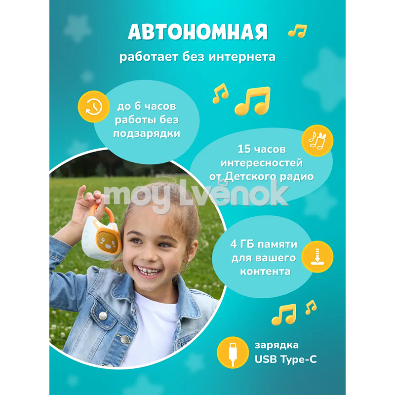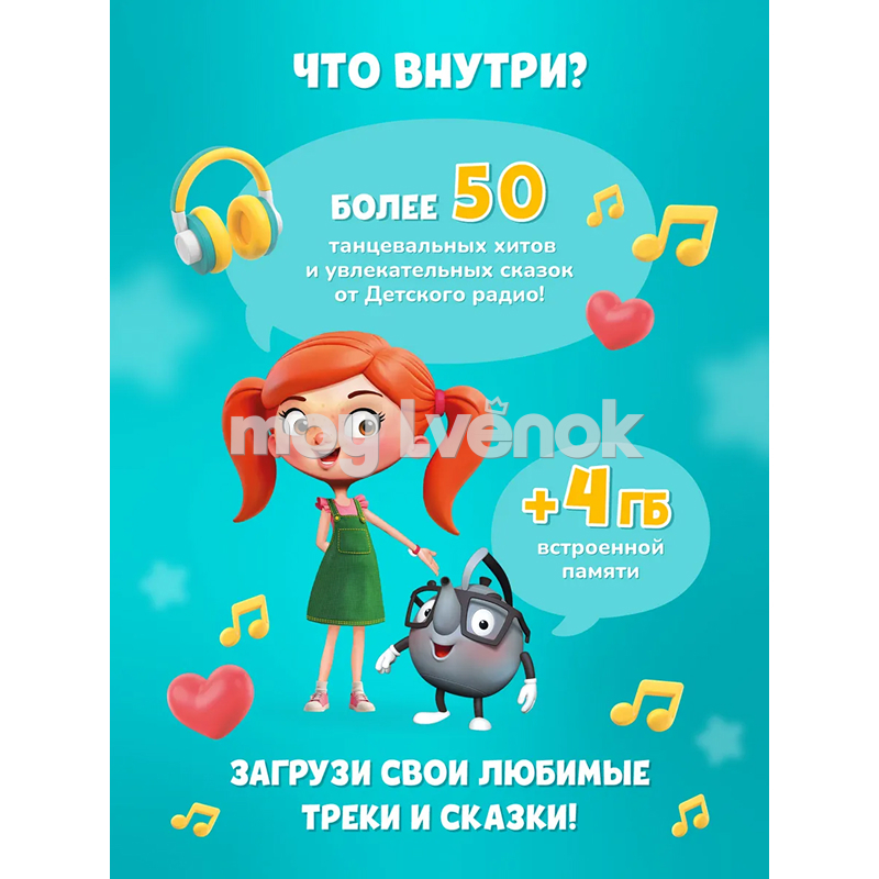 – Добавьте свои сказки и музыку. 4 ГБ встроенной памяти + Bluetooth. Загрузите любимый контент вашего ребенка или подключитесь через смартфон.