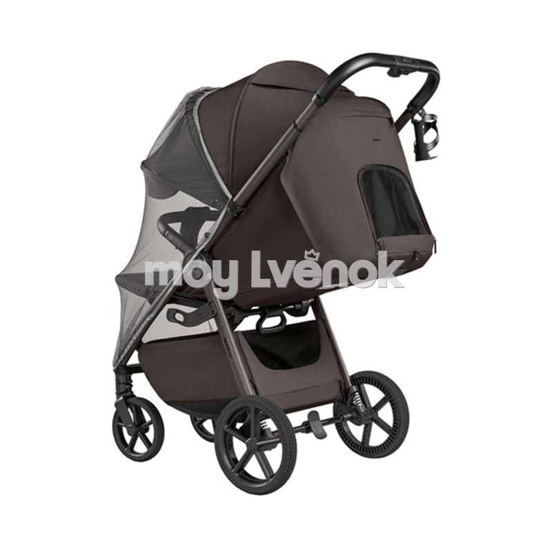 Высокий капюшон (62 см от сиденья) надежно защищает от солнца, ветра и дождя. Пятиточечные ремни безопасности, поворотный бампер и ограничитель от сползания гарантируют безопасность малыша во время прогулок. Дополнительный комфорт обеспечивает подстаканник для родителей.