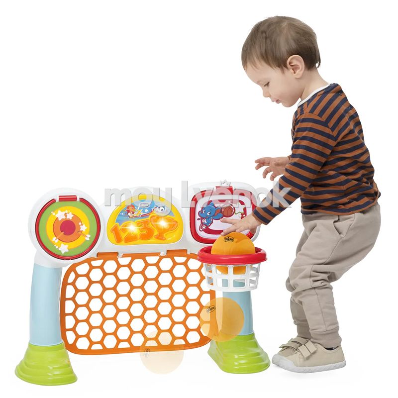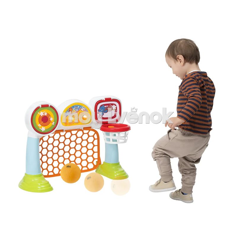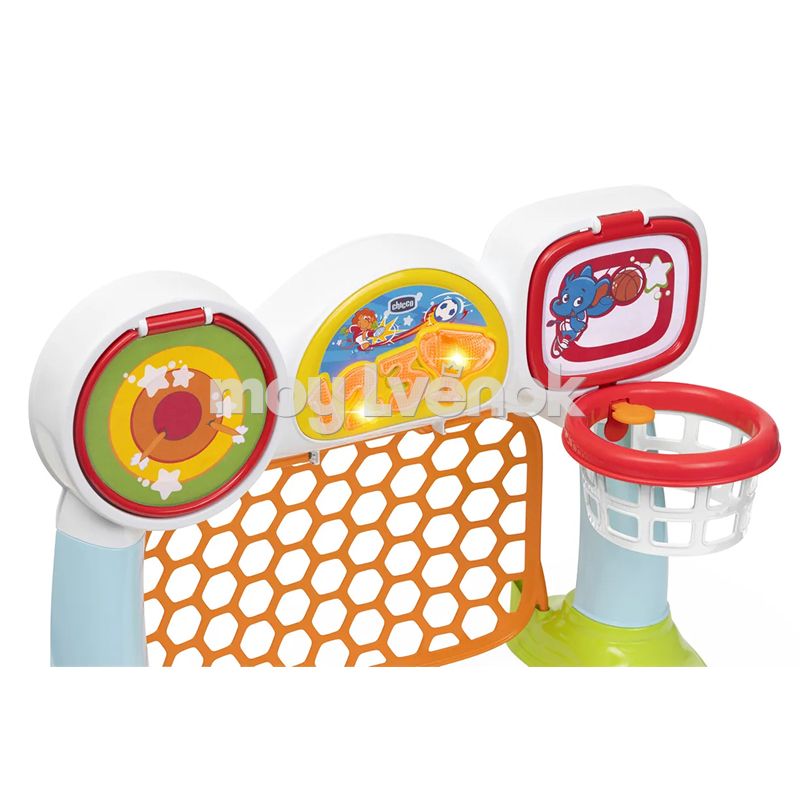 Детский игровой цент Chicco Спортивная лига заменит малышам от 2 до 5 лет сразу три игрушки: футбольные ворота, баскетбольное кольцо и попади в цель.