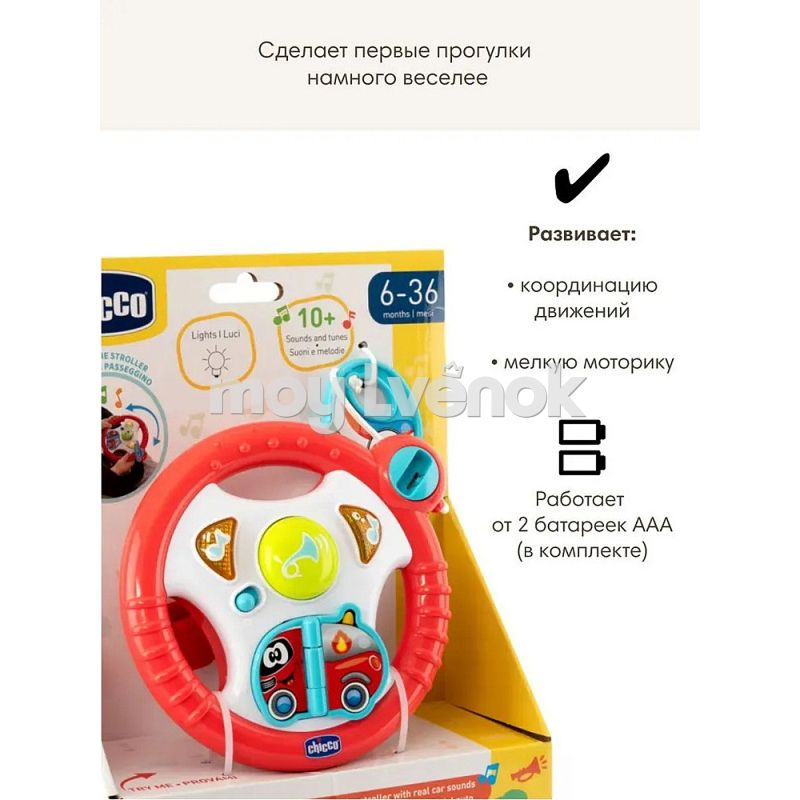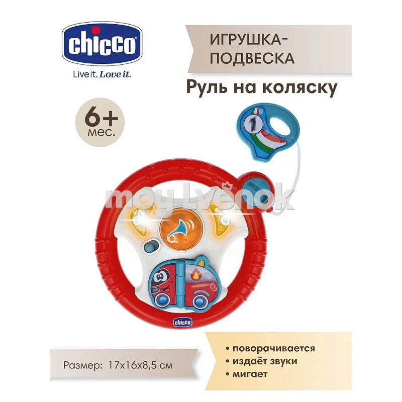 Развивающая игрушка-подвеска Chicco Руль на коляску для малышей от 6 месяцев до 3 лет сделает первые прогулки намного веселее.