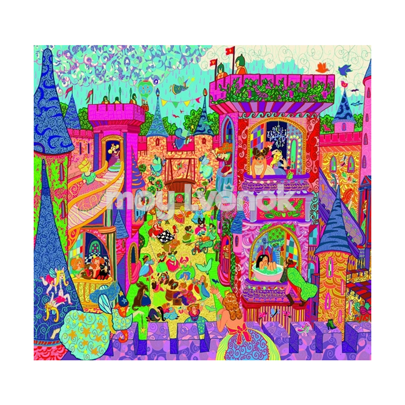 - Кроме этого, на собранном пазле красуется огромный сказочный замок с его высокими башнями, винтовыми лестницами и пестрыми куполами.