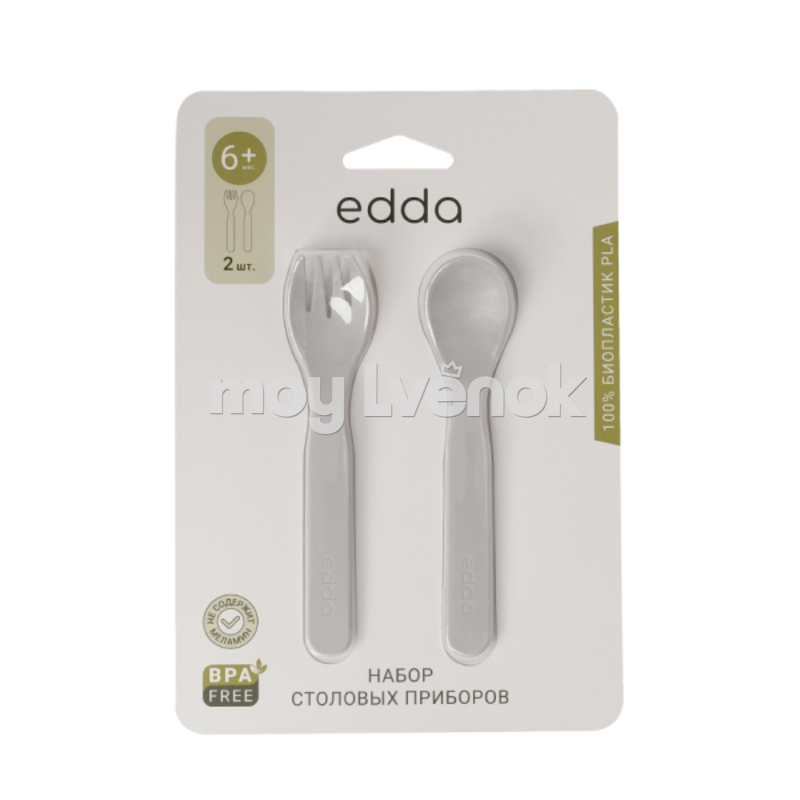 из пищевого биопластика на основе кукурузного крахмала и сахарного тростника. Лёгкие ложка и вилка без острых краёв и зубчиков, с приятной матовой поверхностью — первые «взрослые» приборы малыша. Приборы эргономичны, разработаны специально для детской ладошки и не скользят. Лёгкие и удобные приборы выполнены в нежных, поэтичных оттенках и прекрасно сочетаются со всеми предметами посуды edda.