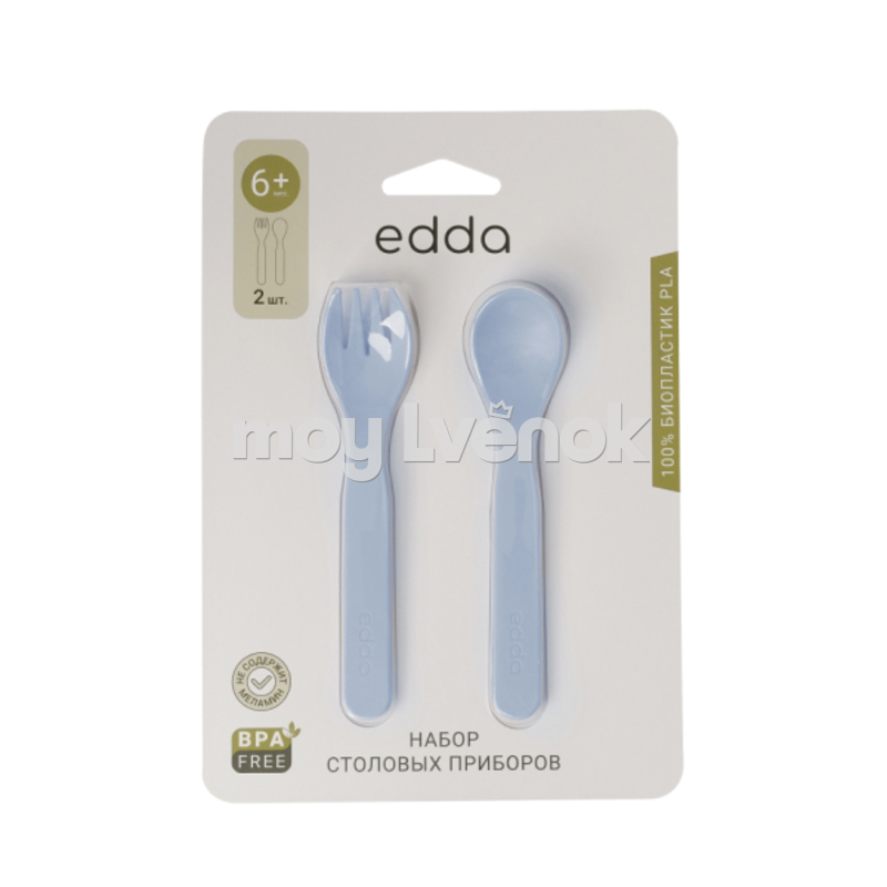 из пищевого биопластика на основе кукурузного крахмала и сахарного тростника. Лёгкие ложка и вилка без острых краёв и зубчиков, с приятной матовой поверхностью — первые «взрослые» приборы малыша.