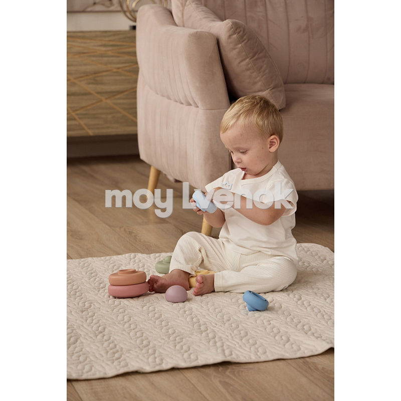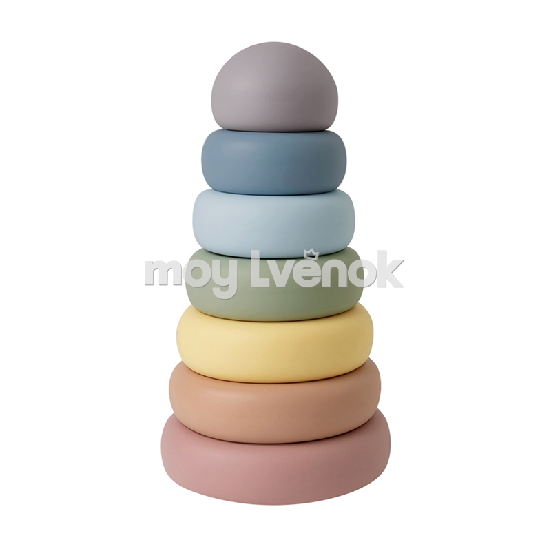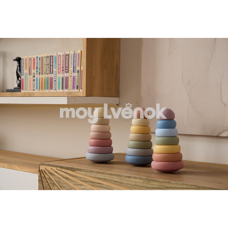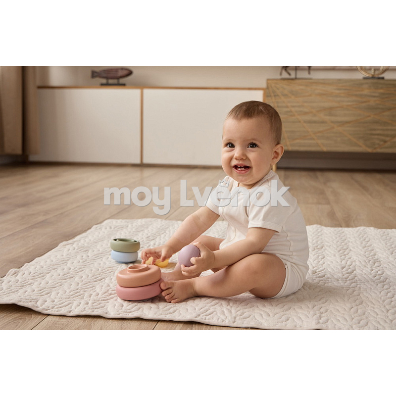 Пирамидка развивает мелкую моторику, логическое мышление и координацию малыша. Мягкая цветовая палитра игрушки гармонично сочетается с интерьером детской.