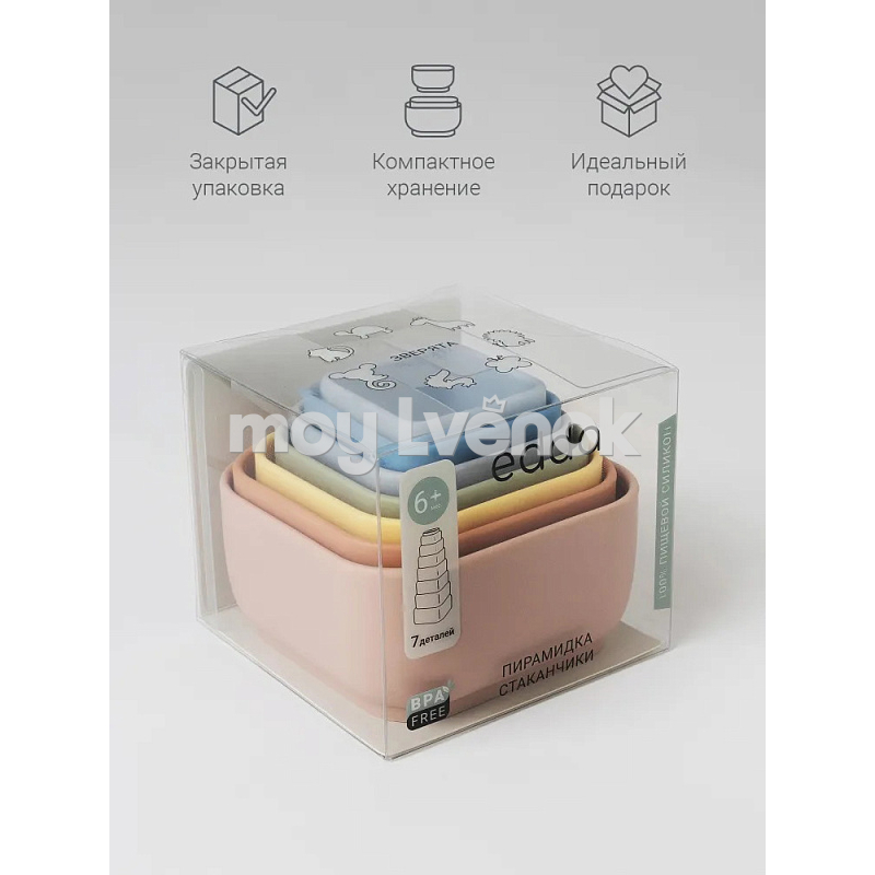 Набор edda состоит из семи стаканчиков разной формы, которые ребёнок может собирать в яркую пирамидку, развивая логику и моторику.