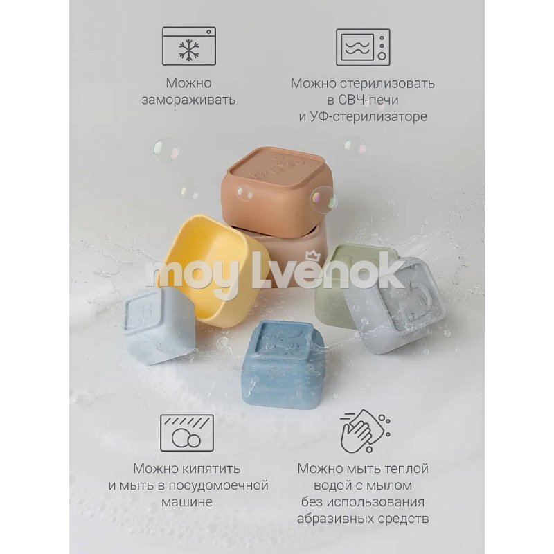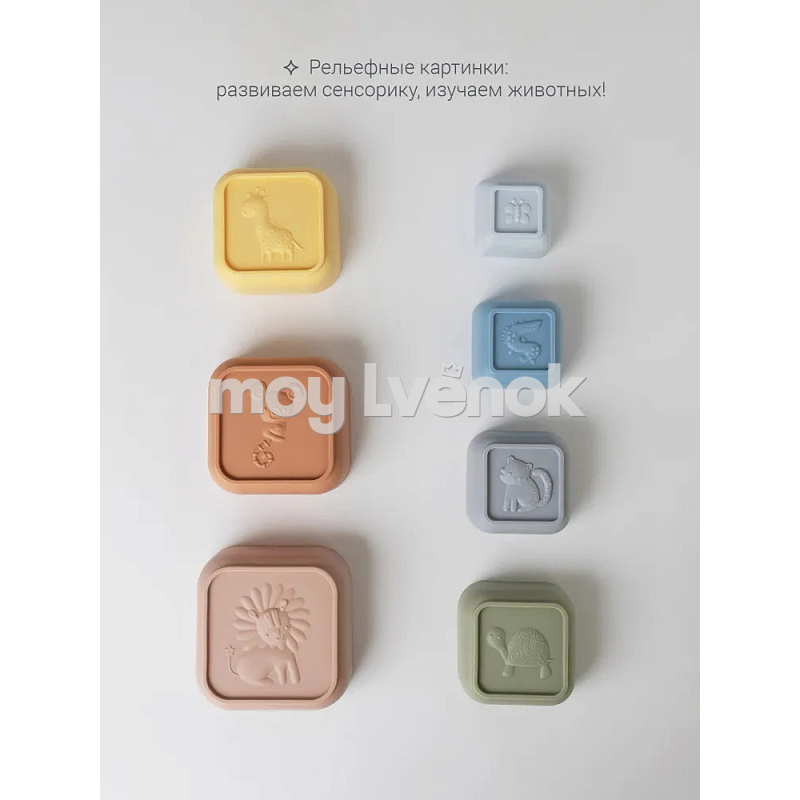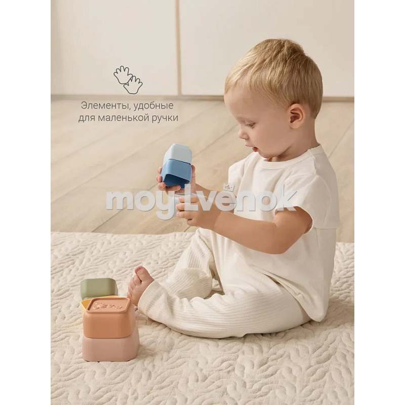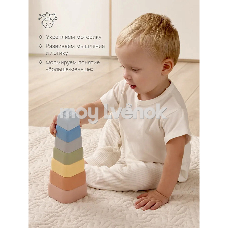 - Веселые игры, простота в уходе — в наборе есть стаканчики с дырочками: так играть с пирамидкой в воде или песке еще интереснее, например в дождик. Пирамидку легко промыть, стерилизовать или прокипятить.