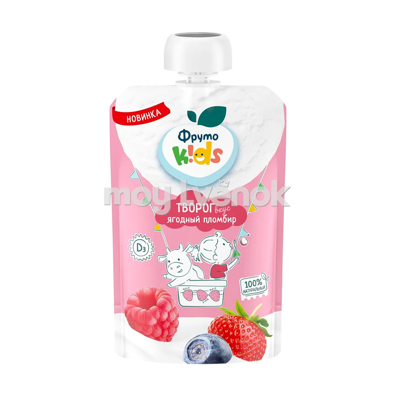Детский творожок с вкусом ягодного пломбира. Консистенция однородная, кремовая.