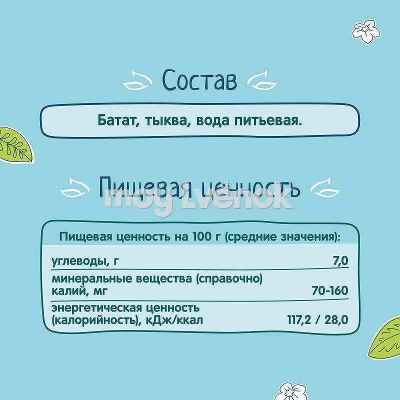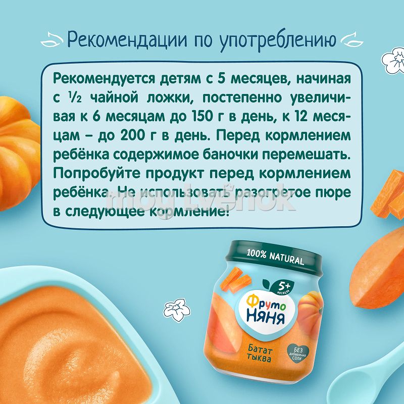 Пюре «ФрутоНяня» из батата и тыквы — это нежное сочетание сладковатого вкуса батата и мягкости тыквы, которое понравится малышу с первых ложечек.