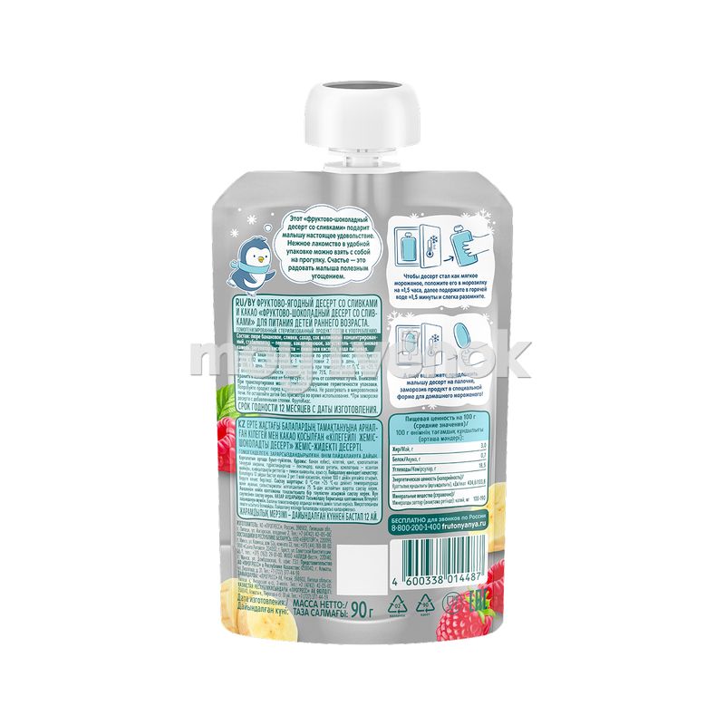 Нежное лакомство в удобной мягкой упаковке можно взять с собой на прогулку. Здесь фрукты, какао, натуральные сливки и никаких консервантов, искусственных ароматизаторов и красителей! Яркая красочная упаковка с забавными героями порадует вашего малыша.