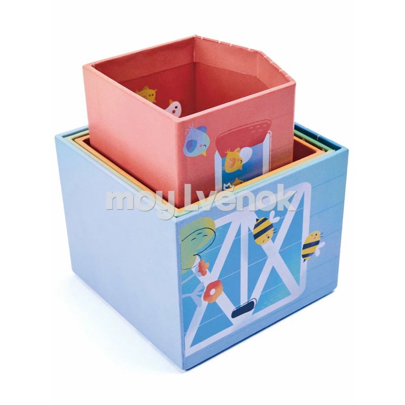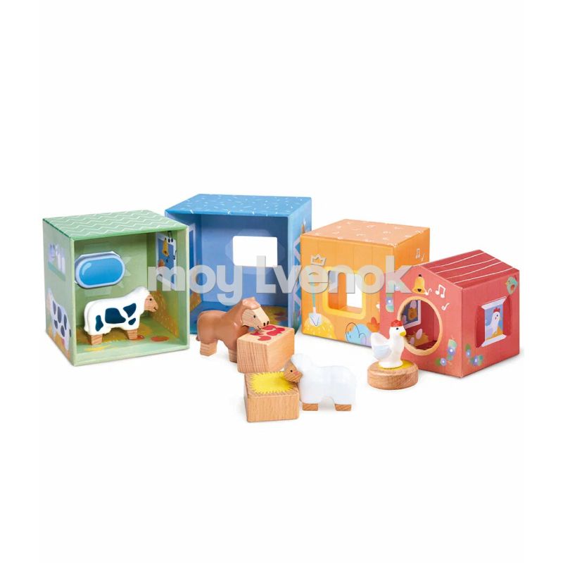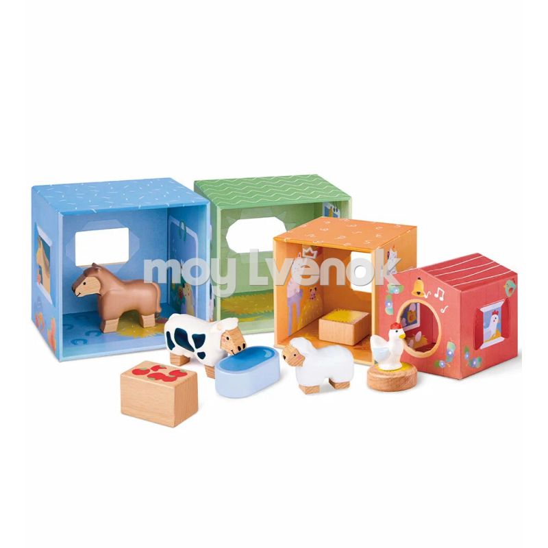 Комплектация: книга, 4 картонных куба, 4 фигурки животных, 4 порции еды.