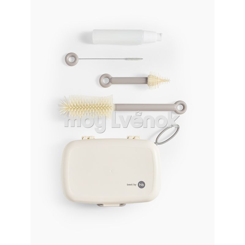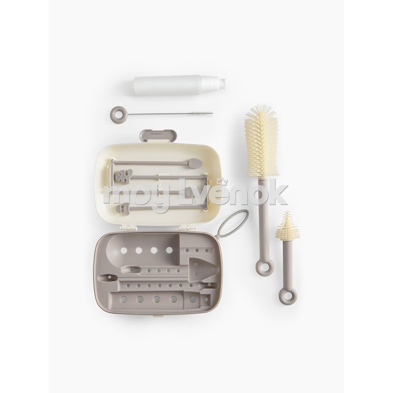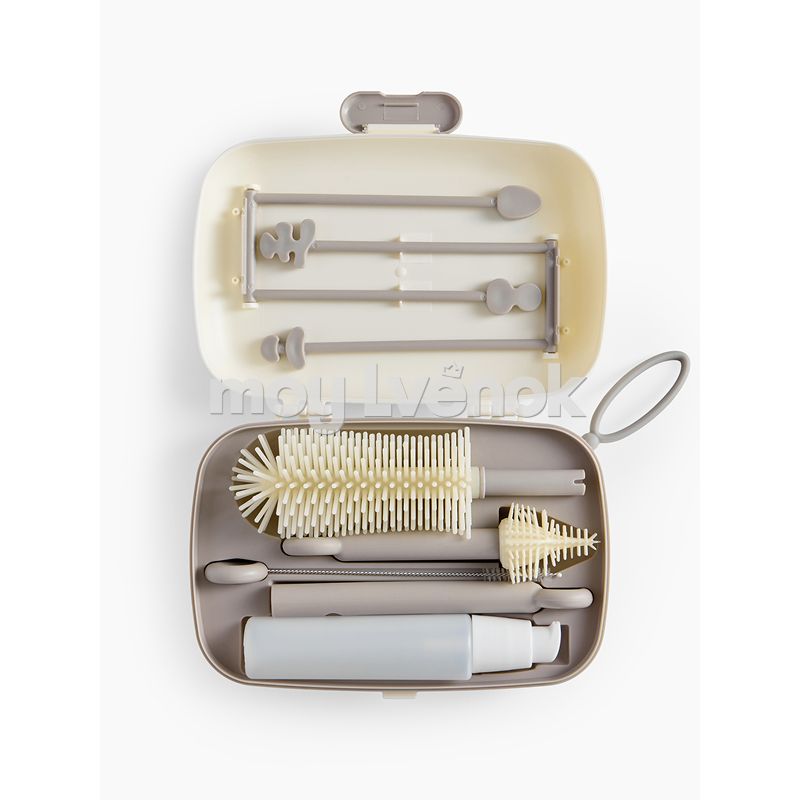 Комплектация: ершик для чистки бутылочек - 1 шт; ершик для чистки сосок - 1 шт; ершик для чистки трубочек - 1 шт; дозатор для моющего средства 50 мл - 1 шт; сушилка контейнер для хранения - 1 шт.