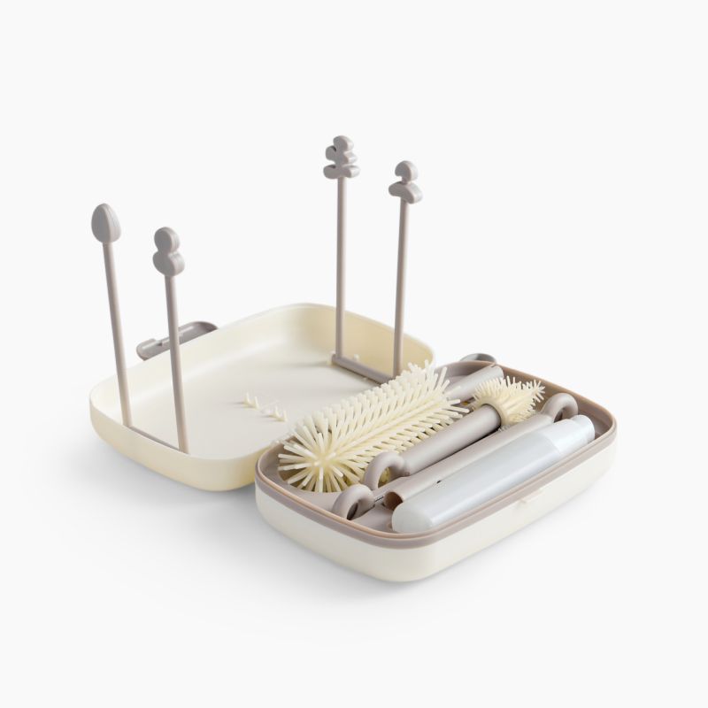 - В комплект входят: большой ершик для бутылок, щётка для сосок с гибким наконечником, щётка для трубочек, дозатор для моющего средства на 50 мл, сушилка-контейнер для хранения
