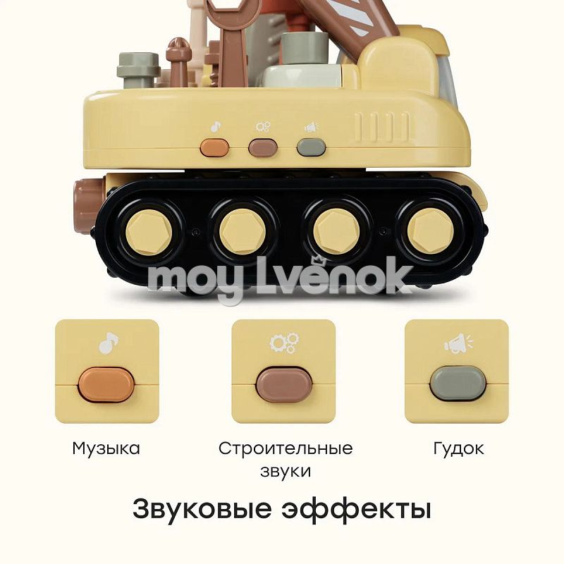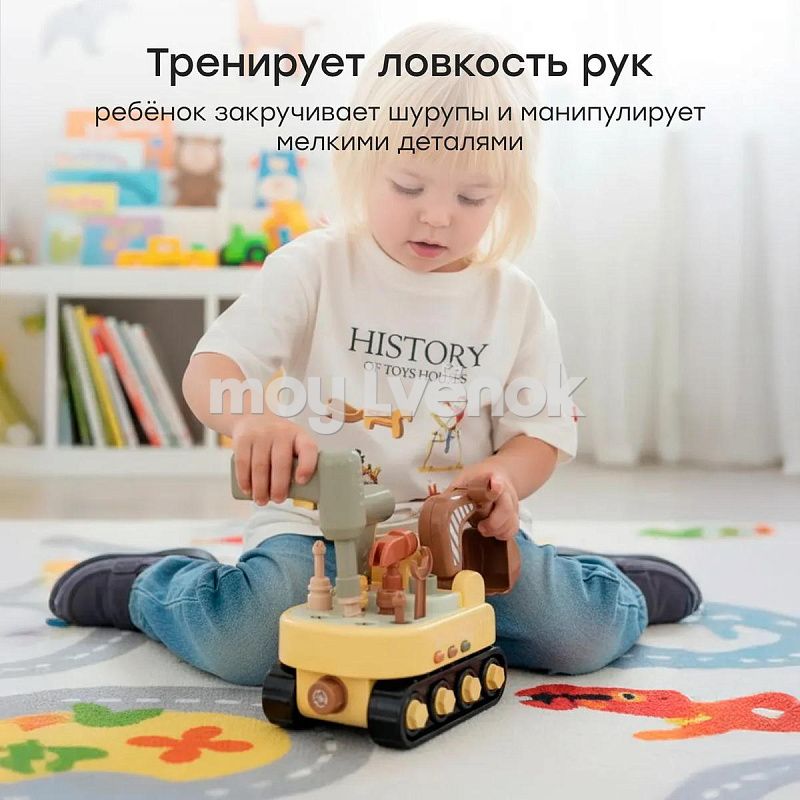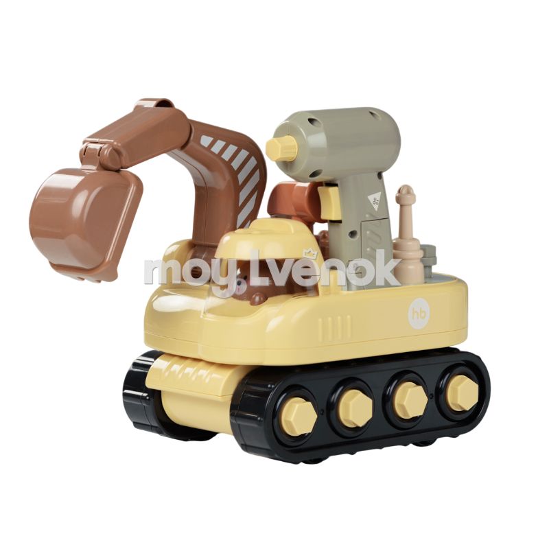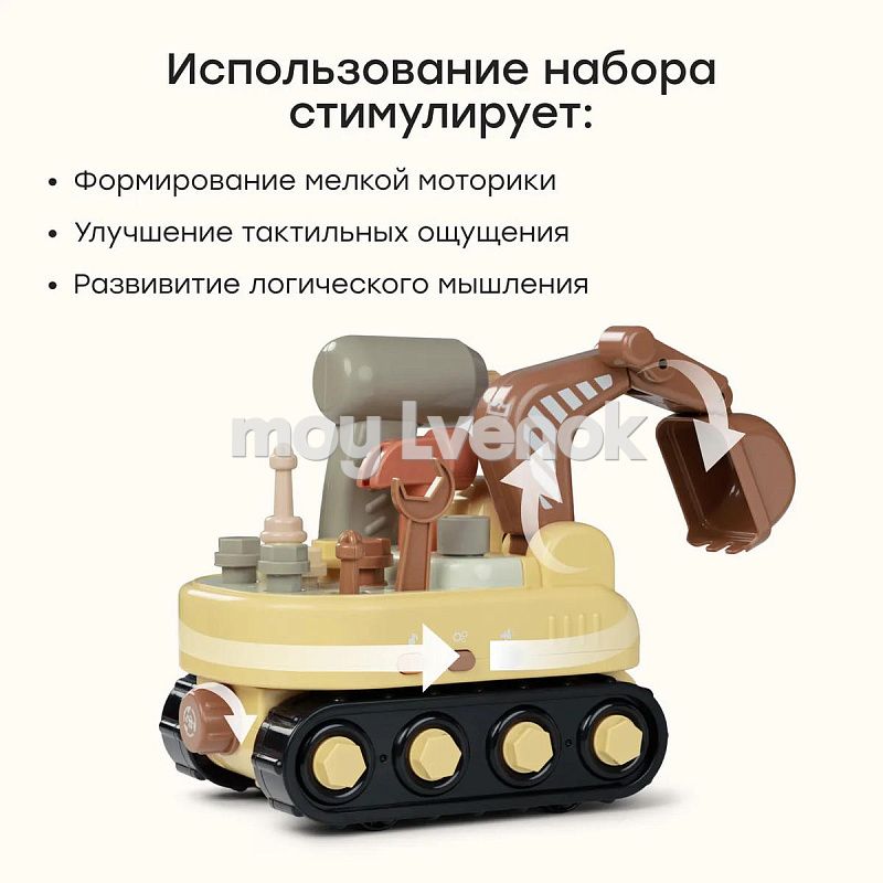 Мини экскаватор с подвижным ковшом и вращающейся базой выполнен в формате игрового набора со сменными деталями, шурупами и инструментами. Ребенок использует отвертку и ключ, закручивает крепления, собирает экскаватор, как настоящий мастер и тем самым развивает мелкую моторику, ловкость рук, координацию и логическое мышление.