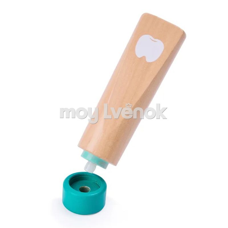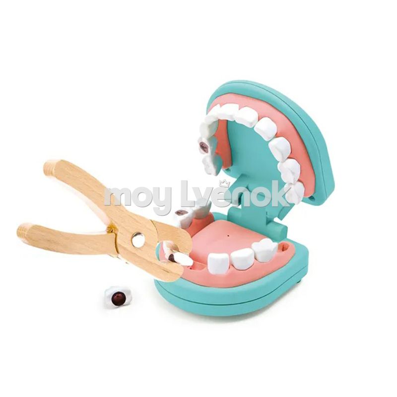 - 19 предметов в наборе — включает всё необходимое для игры в стоматологическую клинику: зеркало, шприц, щипцы, полировочный инструмент, зубная щётка, зубная паста, зубная нить, челюсть с зубами, бейдж, наклейки, карточки и др.