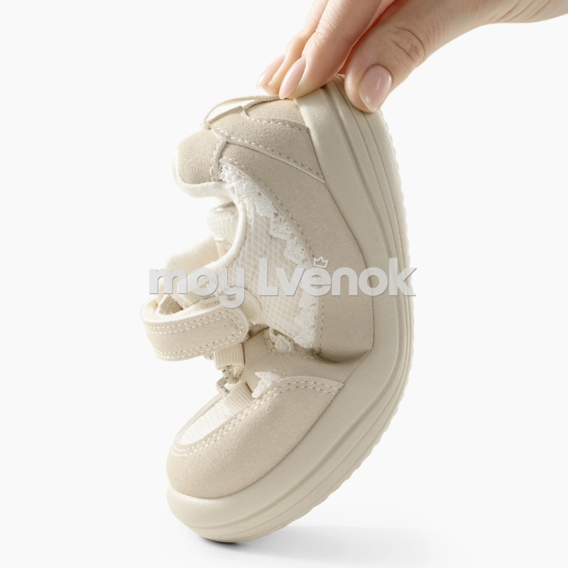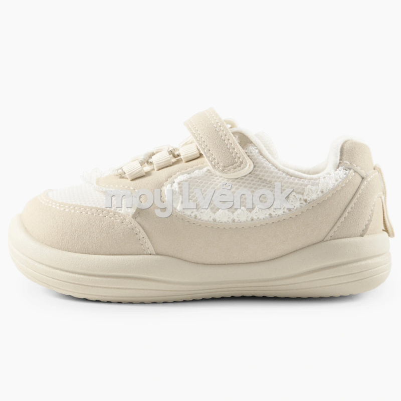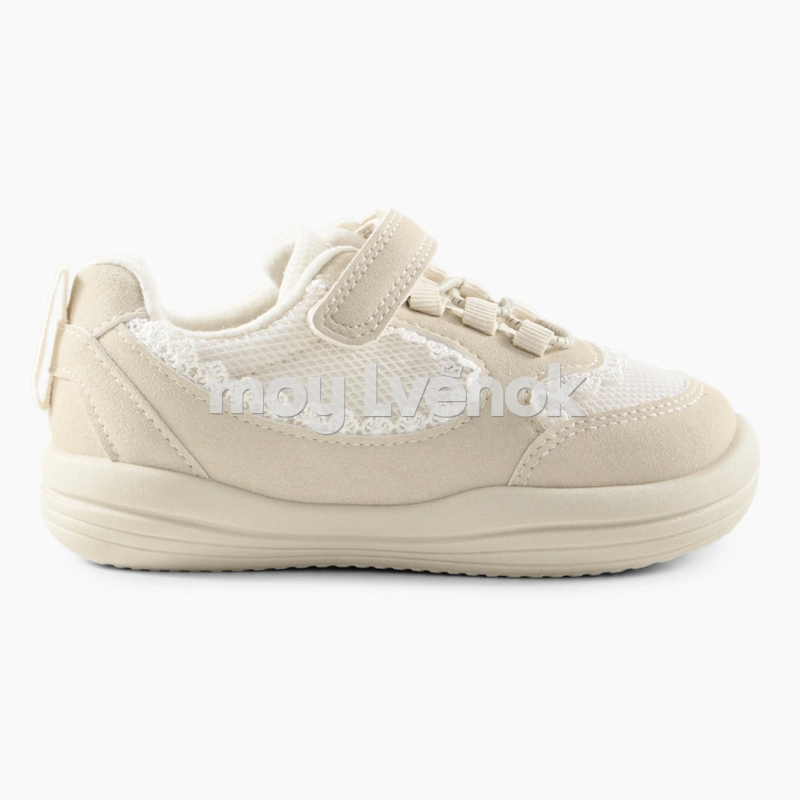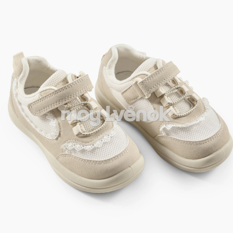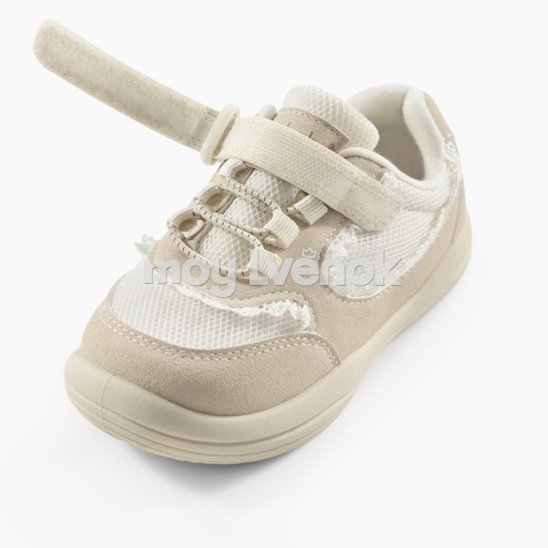 Нежные детские кеды в светлой бежево-молочной гамме — лёгкая и удобная модель для повседневной носки. Верх выполнен из дышащей сетки в сочетании с мягкими вставками под замшу, что обеспечивает комфорт и хорошую вентиляцию в течение дня.