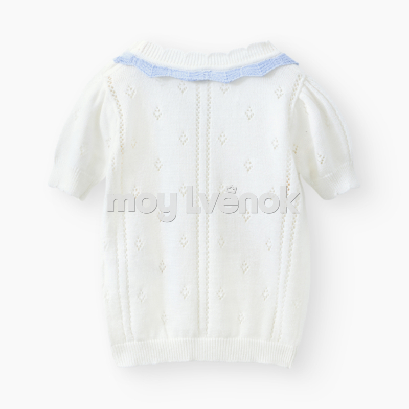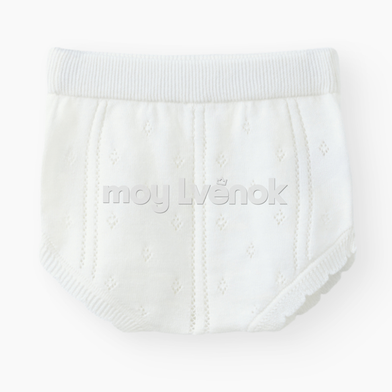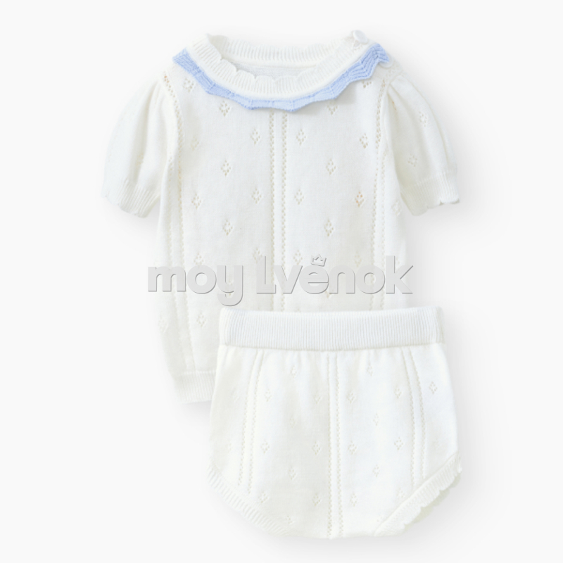 • Продуманная конструкция - футболка с рукавами-фонариками украшена аккуратными оборками, а также имеет застежку на плечевом шве, а шорты, выполненные в том же стиле, учитывают пространство под подгузник, их легко надевать и снимать благодаря поясу на мягкой резинке