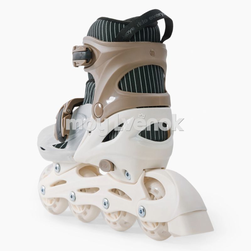 Раздвижная конструкция делает коньки трансформеры «растущими» и позволяет использовать один комплект несколько лет подряд. Размер регулируется с помощью кнопки, обеспечивая правильную посадку и комфорт при катании.
