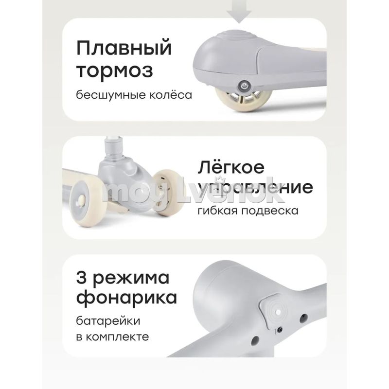 • Трехколесная конструкция — гарантирует максимальную устойчивость и безопасность, даже когда ребенок только учится кататься.