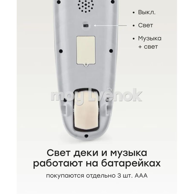 • Светящиеся колеса и музыкальные эффекты — при движении колеса мерцают яркими огоньками, кнопка на руле регулирует режимы фонарика, а переключатель на деке воспроизводит веселые звуки.
