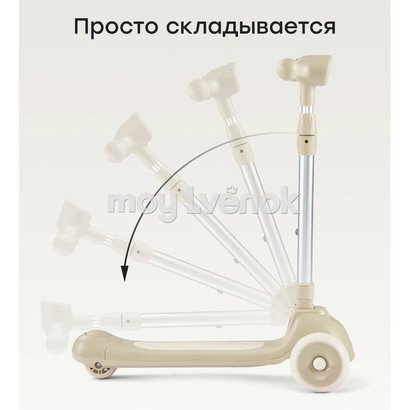 - Складная конструкция и антискользящая дека — детский самокат легко сложить для хранения или транспортировки. Рельефное покрытие на подножке надёжно фиксирует ножку ребенка, предотвращая соскальзывание.