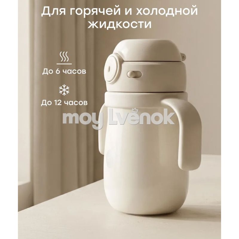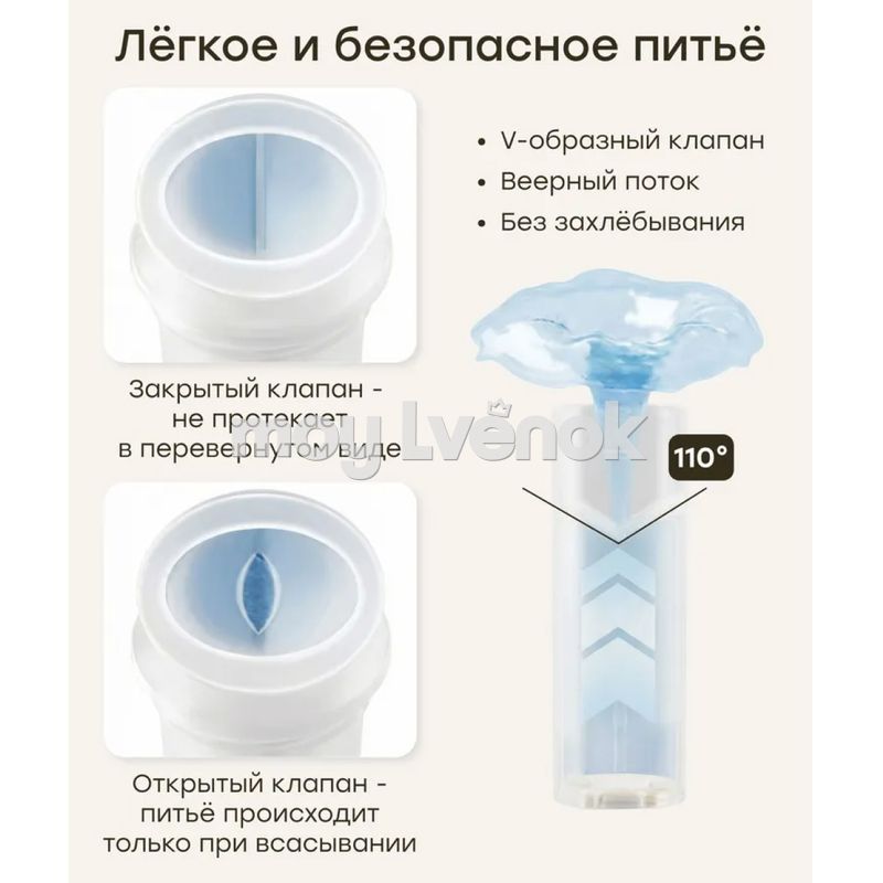 Термобутылочка детская оснащена V-образным клапаном, который выравнивает давление в емкости и исключает слипание трубочки. Благодаря удобным ручкам поильника, ребёнок легко удерживает бутылочку поильник без помощи взрослых, развивая координацию.