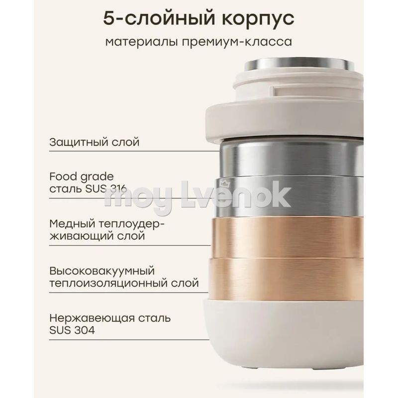 5-ти слойный корпус термобутылочки позволяет жидкости охлаждаться при температуре воздуха 25°C с 55°C до 43°C за 6 часов и нагреваться с 5°C до 13,7°C за 12 часов.