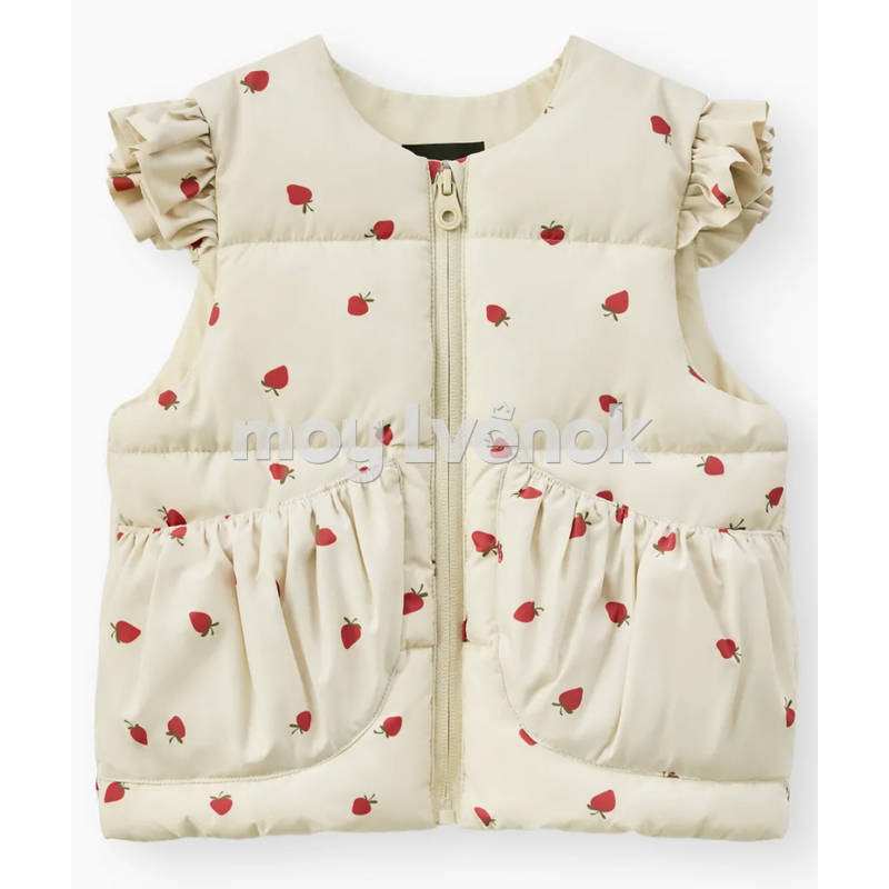 Практичная застёжка на молнии позволяет быстро надевать и снимать жилетку, что особенно удобно для одежды в садик. Детский жилет утеплённый, имеет прямой крой, комфортную длину и внешние карманы, а плечи украшены аккуратными оборками.