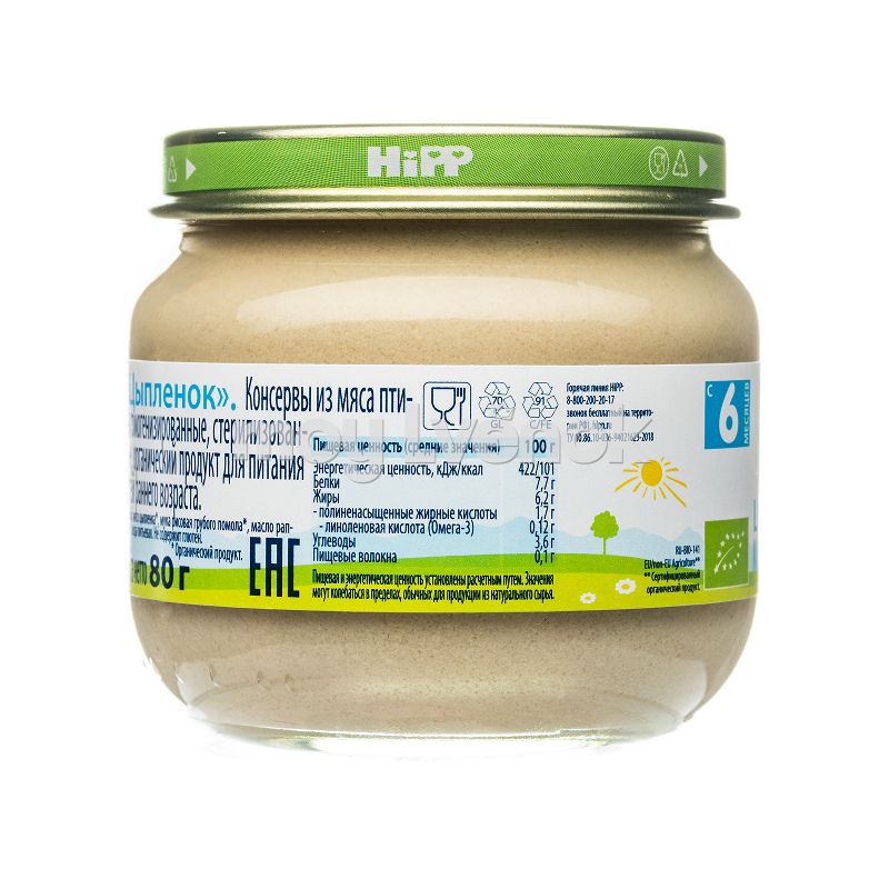 - HiPP органический цыпленок обладает приятным вкусом и нежной консистенцией, которая очень нравится малышам.