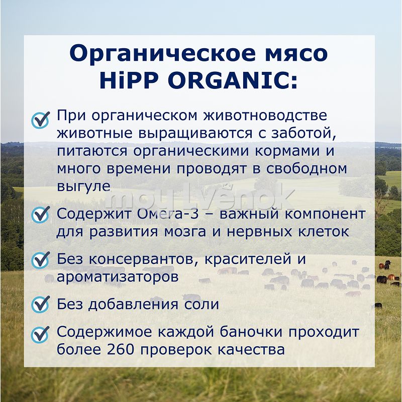 Органическое мясо для компании HiPP выращивается на органическом корме и в естественном ритме на обширных пастбищах.