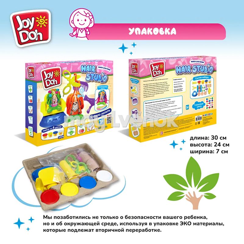 Ваш малыш постриг кота? Набор для лепки «Hair Studio» от Joy-Doh поможет вашему ребенку почувствовать себя настоящим парикмахером! В наборе есть забавные человечки с разноцветными волосами, а еще фен, расческа, и ножницы. В наборе также есть формы украшений для волос: бантики, заколки, цветочки и др. Малыш научится сам стричь волосы, заплетать косички и делать красивые прически. Масса для лепки Joy-Doh - круче, чем обычный пластилин! С Joy-Doh весело лепить!
