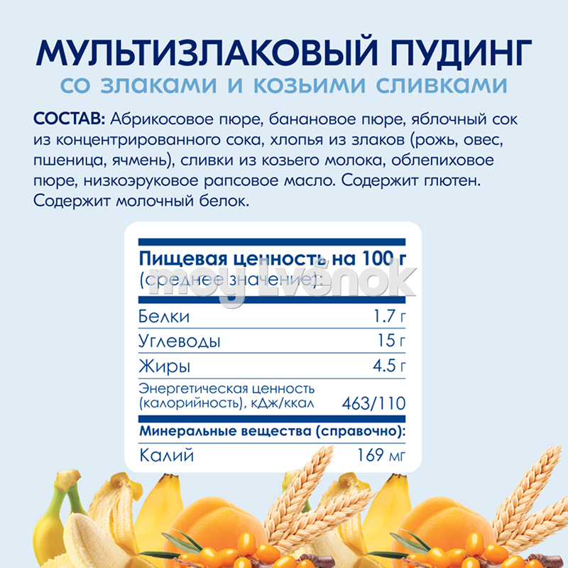 Абрикосовое пюре, банановое пюре, яблочный сок из концентрированного сока, хлопья из злаков (рожь, овес, пшеница, ячмень), сливки из козьего молока, облепиховое пюре, низкоэруковое рапсовое масло. Содержит глютен. Содержит молочный белок.
