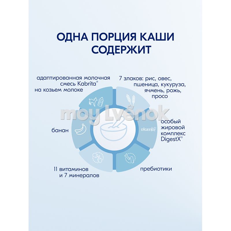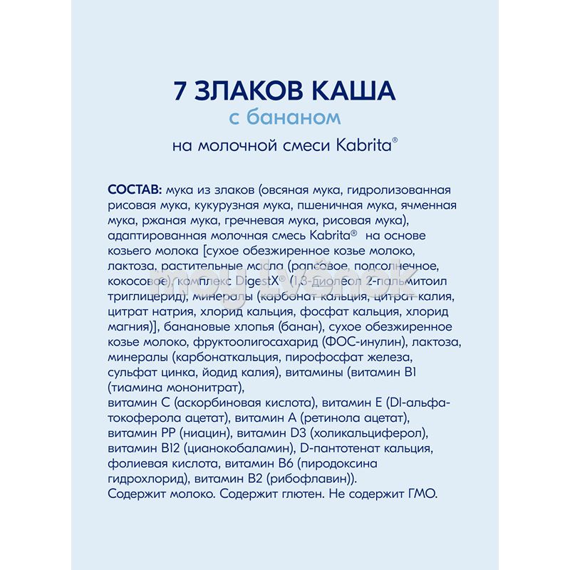 Мука из злаков (овсяная мука, гидролизованная рисовая мука, кукурузная мука, пшеничная мука, ячменная мука, ржаная мука, гречневая мука, рисовая мука), адаптированная молочная смесь Kabrita® на основе козьего молока [сухое обезжиренное козье молоко, лактоза, растительные масла (рапсовое, подсолнечное, кокосовое), комплекс DigestX® (1,3-диолеол 2-пальмитоил триглицерид), минералы (карбонат кальция, цитрат калия, цитрат натрия, хлорид кальция, фосфат кальция, хлорид магния)], банановые хлопья (банан), сухое обезжиренное козье молоко, фруктоолигосахарид (ФОС-инулин), лактоза, минералы (карбонат кальция, пирофосфат железа, сульфат цинка, йодид калия), витамины (витамин В1 (тиамина мононитрат), витамин С (аскорбиновая кислота), витамин Е (Dl-альфа-токоферола ацетат), витамин А (ретинола ацетат), витамин PP (ниацин), витамин D3 (холикальциферол), витамин В12 (цианокобаламин), D-пантотенат кальция, фолиевая кислота, витамин В6 (пиродоксина гидрохлорид), витамин В2 (рибофлавин)).