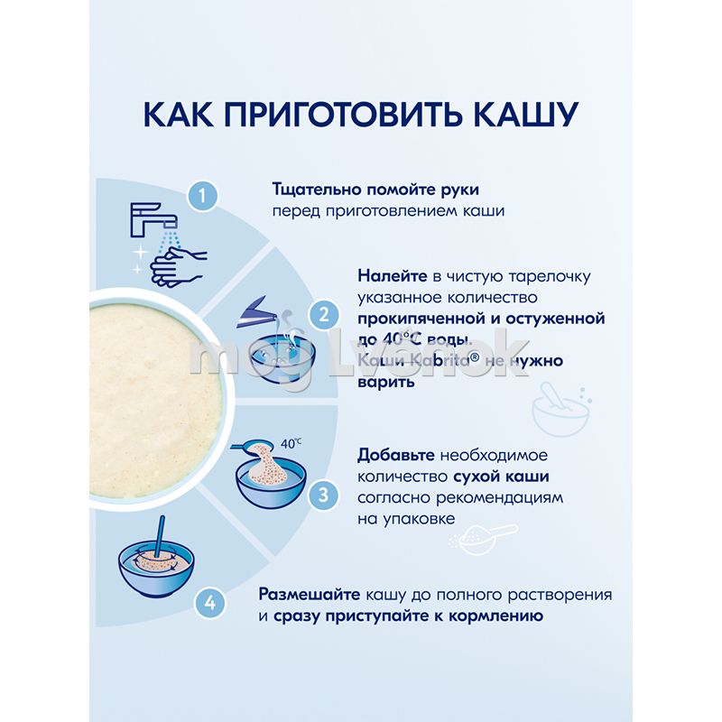 - Технология «бережного расщепления зерна» облегчает пищеварение, позволяет сохранить естественную сладость злаков. Благодаря этой технологии каши Kabrita® имеют воздушную, нежную структуру и идеально разводятся в воде.