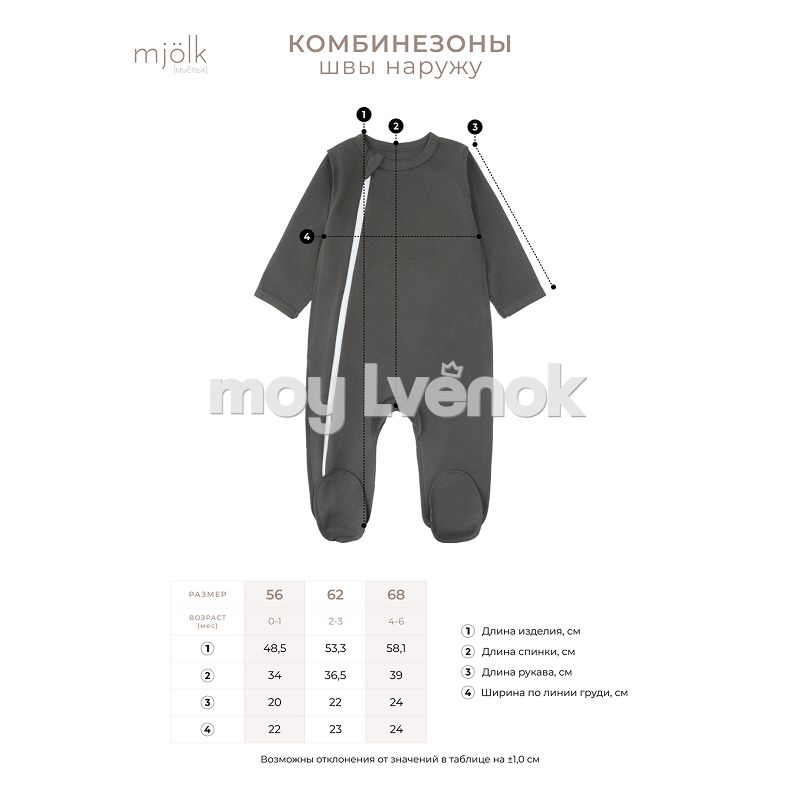 - Комбинезон Mjolk — это детский нательный комбинезон на молнии с закрытой ножкой во всех размерах, выполненный из плотного и очень мягкого трикотажа.