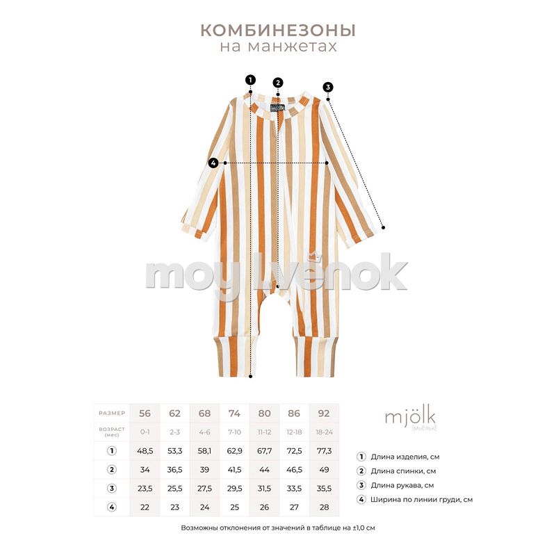 - Комбинезон Mjolk — это детский нательный комбинезон на молнии с открытой ножкой и широкими манжетами во всех размерах, выполненный из плотного и очень мягкого трикотажа.