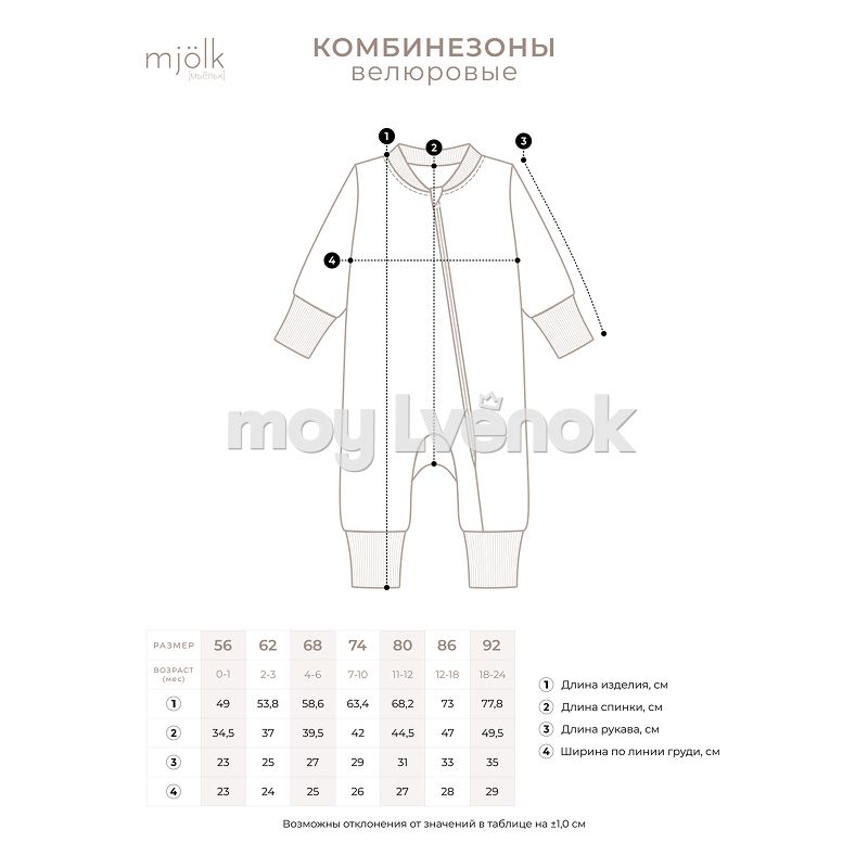 - Велюровый комбинезон Mjolk — это детский комбинезон на молнии с открытой ножкой и мягкими манжетами во всех размерах, выполненный из тёплого хлопчатобумажного велюра с небольшой добавкой синтетической ткани, которая делает его более прочным. Он станет отличным комбинезоном для прохладной погоды. Можно носить как первый или сторой слой, использовать в качестве пижамы или поддевы.