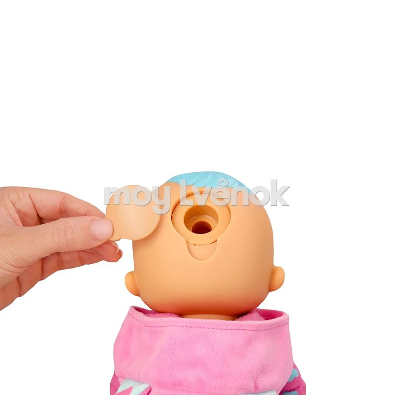 - Для того чтобы слезы вытекали из глаз при нажатии на голову, необходимо залить воду в специальный отсек на голове куклы и вынуть пустышку.