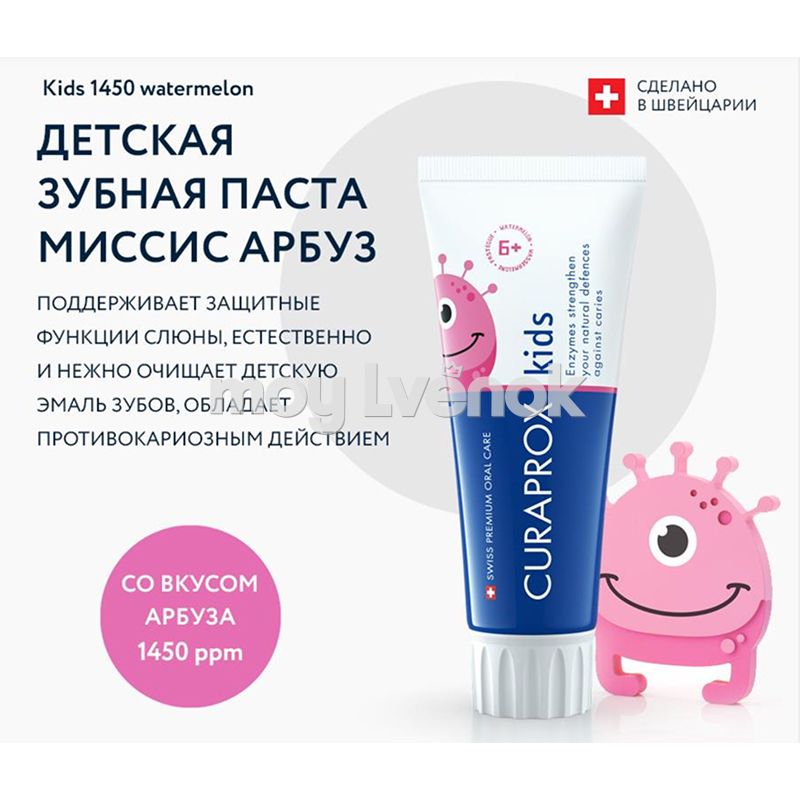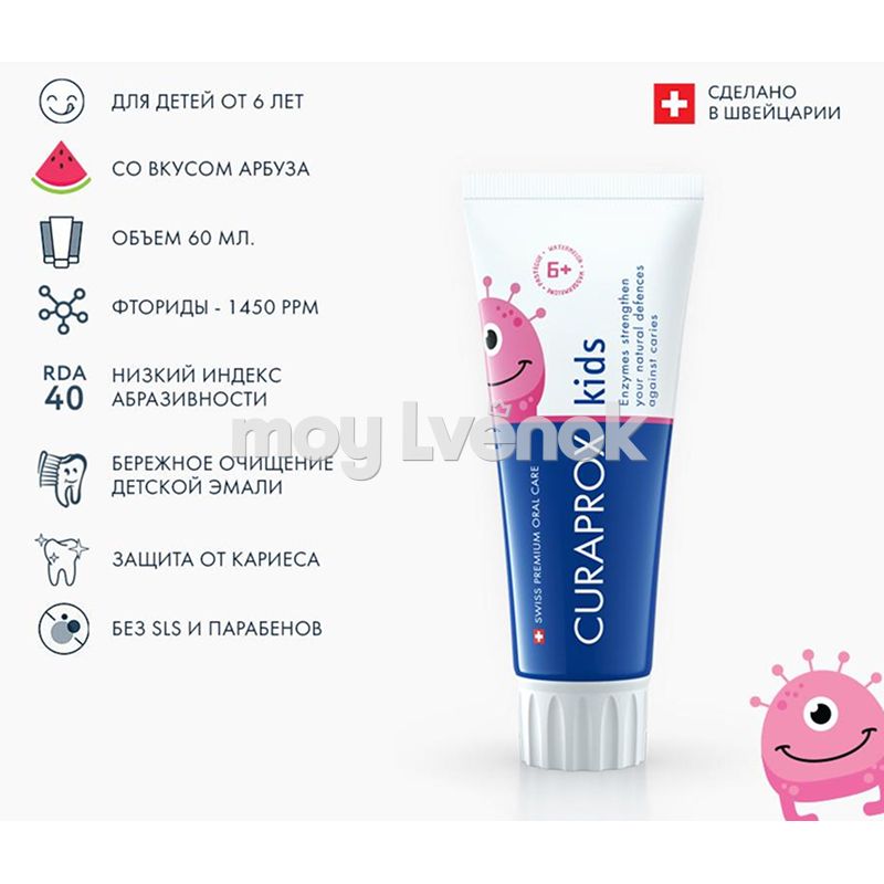 Детская зубная паста «Kids» со вкусом арбуза предназначена для детей с 6 лет и старше.